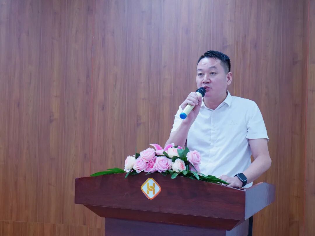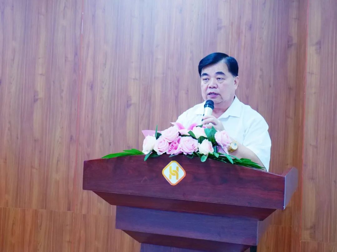 张义成董事长上台讲话,他首先肯定了全体教职工过去一年的辛勤付出,高度赞扬集团高考佳绩及招生突破等成果,并提出下一学年 “1273” 目标,要求优化管理与教学。承诺将改善教师发展环境,希望教师坚守初心、精进学识、勇于创新、心怀仁爱,共筑粤东一流、全省先进的品牌学校。