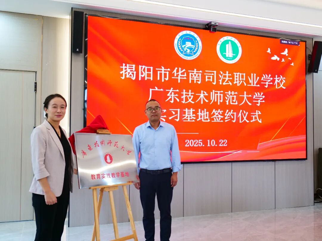 为深化校校合作,推动教育资源共享,强化学生实践能力培养。10月22日,广东技术师范大学计算机科学学院与揭阳市华南司法职业学校举行教育实践教学基地签约授牌仪式。两校代表齐聚一堂,共同见证这一助力职业教育高质量发展的重要时刻,为学子搭建起 “理论学习 + 实践锻炼” 的成长新平台。