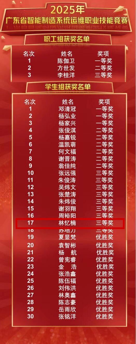 在刚落幕的2025年广东省智能制造系统运维职业技能大赛中,我校25级工业机器人班林忆楠同学以扎实的专业功底和沉稳的赛场表现,从全省28所大中专院校选手中脱颖而出,勇夺个人赛三等奖!这是我校在智能制造领域人才培养的又一突破性成果!