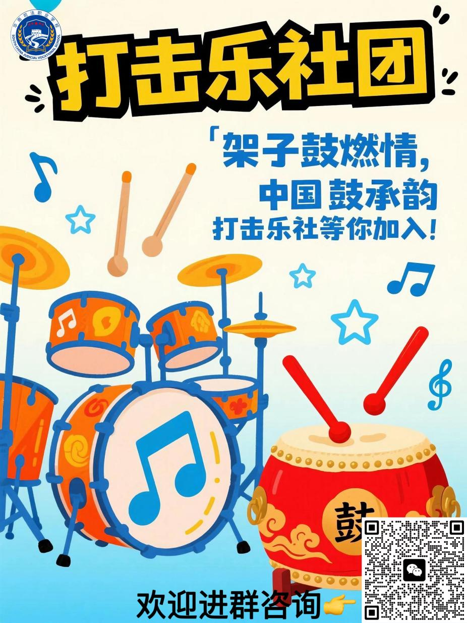想让节奏成为你的语言,用鼓点释放热爱吗?打击乐社团期待你的加入!社团涵盖两个方向:架子鼓以动感节奏为魂,从摇滚的热血到爵士的灵动,带你玩转现代节拍,零基础也能上手,在鼓槌起落间解锁舞台魅力;中国鼓则承载传统文化底蕴,激昂鼓点奏响千年韵味,无论是经典鼓乐演绎,还是创意编排,都能让你感受传统乐器的磅礴力量。 这里有老师指导、趣味排练、表演展现,还有有趣的小伙伴,无论你是想学习技能,还是寻找志同道合,打击乐社团都能成为你展现自我的舞台!快来加入吧,让我们一起用鼓点点燃青春!