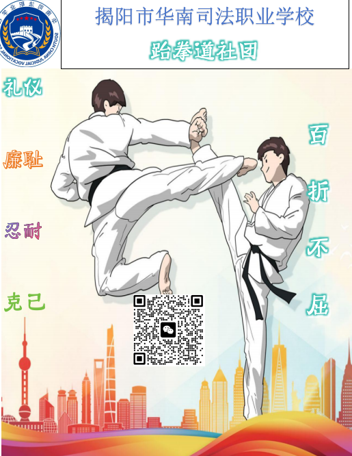 跆拳道社团秉承“礼仪、廉耻、忍耐、克己、百折不屈”的跆拳道精神,奉行团结、自强、进取,发展互助的原则,以丰富学生的课余生活为己任,为同学们构建一个挑战自我、超越极限,强身健体的平台;注重培养人的气质、礼仪、道德修养、忍耐、谦虚和坚韧不拔的精神,它是以技击格斗为核心,以修身养性为基础,以磨练人的意志,振奋人的精神为目的的一项现代竞技体育运动。
