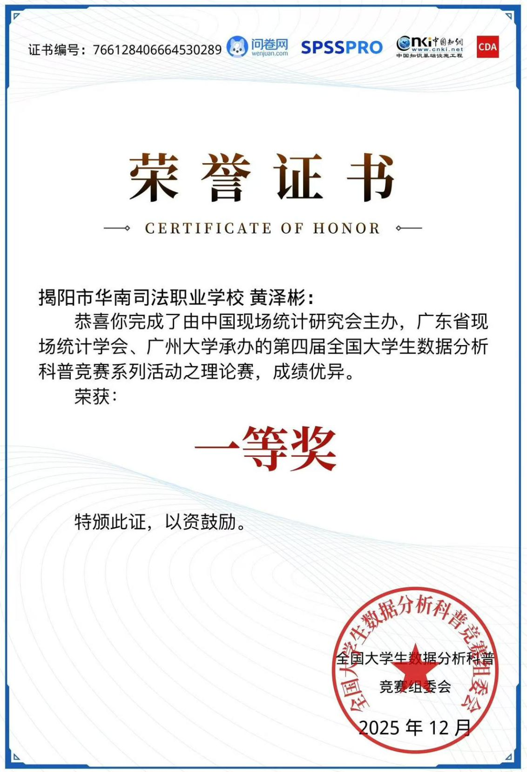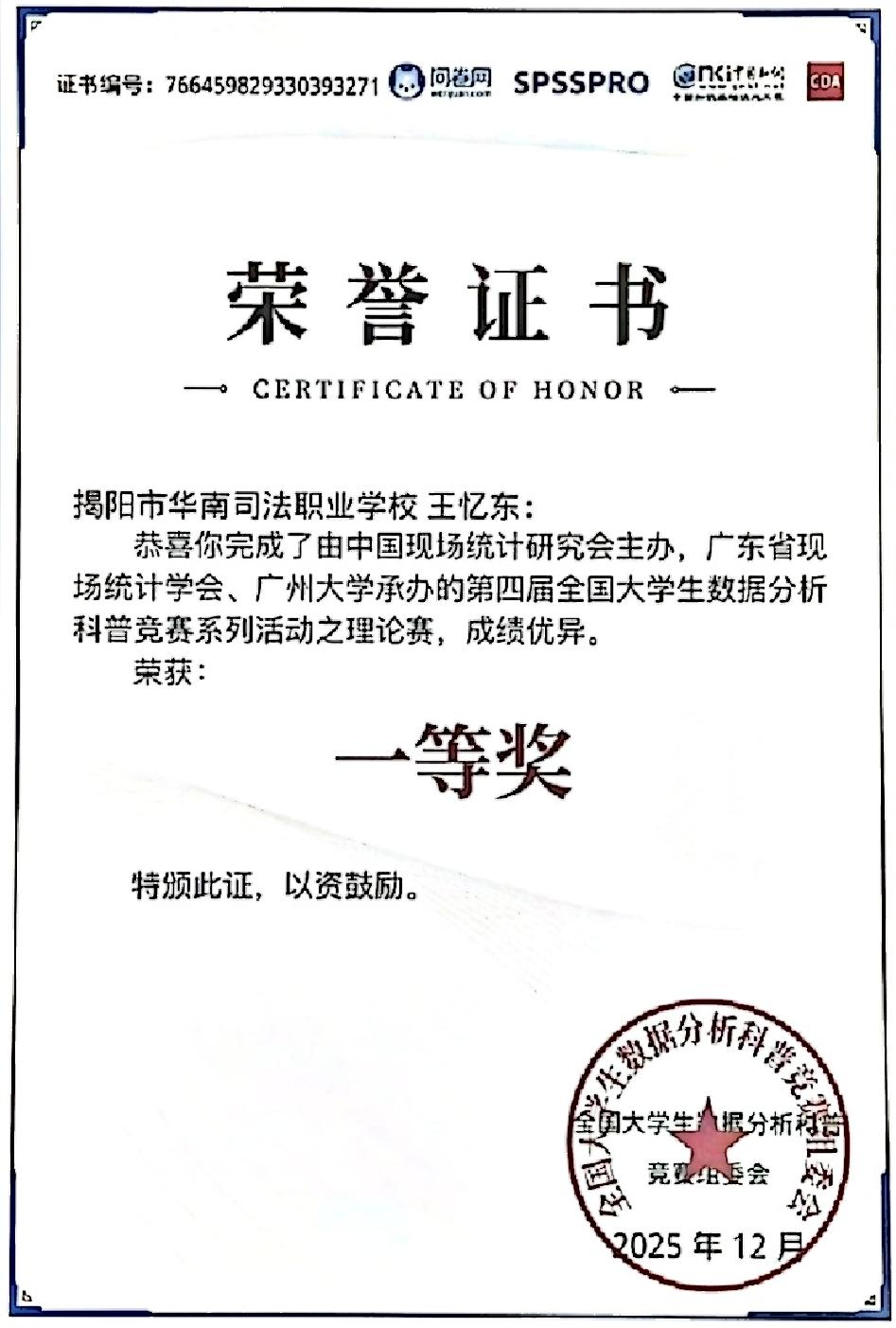 在第四届全国大学生数据分析科普技能竞赛中,黄泽彬、王忆东同学凭借优异表现,分别斩获理论赛一等奖,并双双获得“数据分析专业技能证书”,体现了学生过硬的数据处理与分析能力,为智能决策奠定了坚实基础。