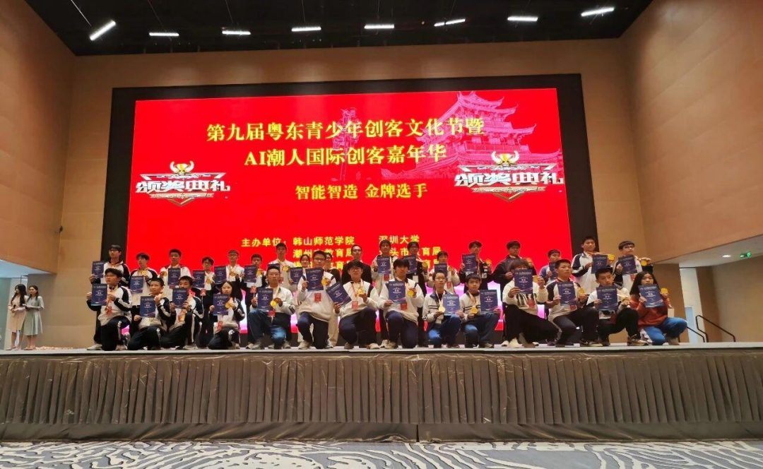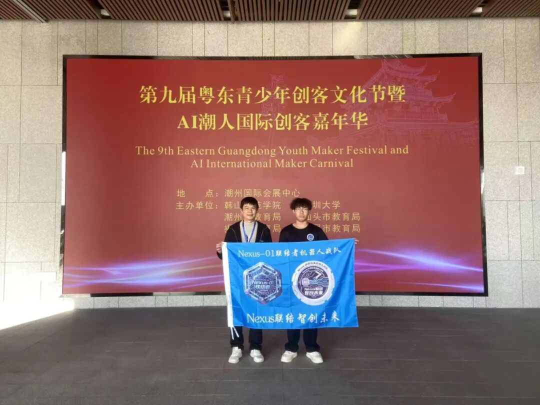 尤为亮眼的是,由我校工业机器人专业学生组成的“Nexus-01 联结者机器人战队”在第九届粤东青少年创客文化节暨AI潮人国际创客嘉年华中荣获冠军;黄泽彬同学荣获“智能智造金牌选手”称号。他们在颁奖典礼上的自信风采,是学校深化产教融合、强化实践教学的最佳印证。