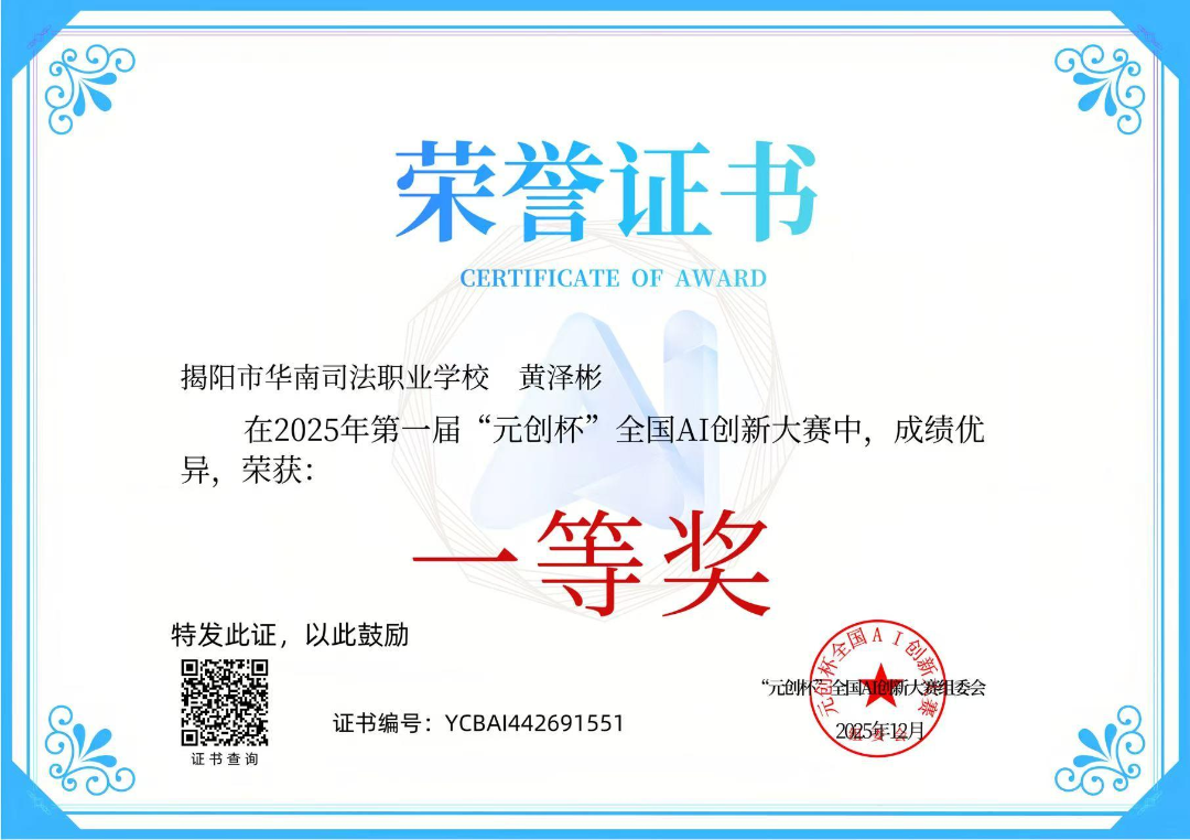 在更具挑战性的2025年首届“元创杯”全国AI人工智能机器人创新大赛中,黄泽彬同学再次脱颖而出,荣获全国总决赛一等奖,这标志着我校学生在人工智能应用与创新层面达到了新的高度。