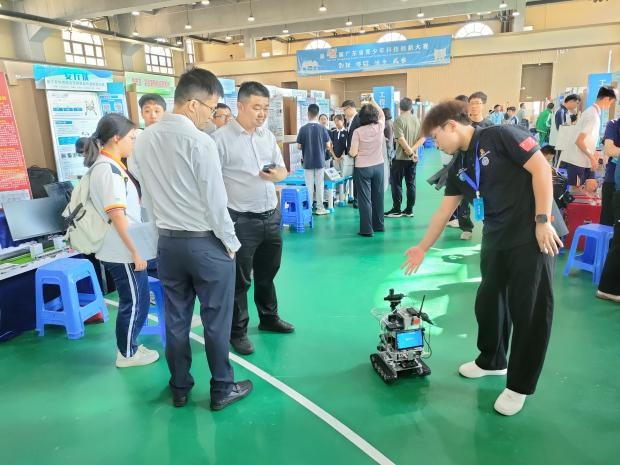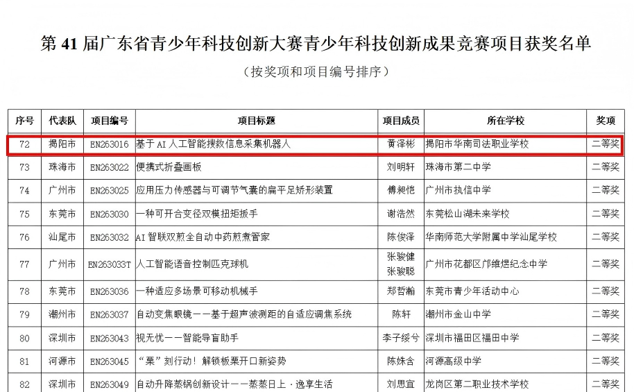 在刚刚落幕的第41届广东省青少年科技创新大赛上,我校25工业机器人职教高考班黄泽彬同学凭自主设计的《基于AI人工智能搜救信息采集机器人》作品,从全省数百个项目中脱颖而出,勇夺大赛二等奖,并荣膺“十佳科技创新奖”!