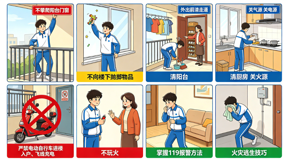 关注居家与消防安全:教育孩子不攀爬阳台、门窗,不向楼下抛掷物品;外出前务必做好“三清三关”(清走道、清阳台、清厨房,关火源、关气源、关电源),严禁电动自行车进楼入户、飞线充电,教育孩子不玩火,掌握119报警方法及火灾逃生技巧。