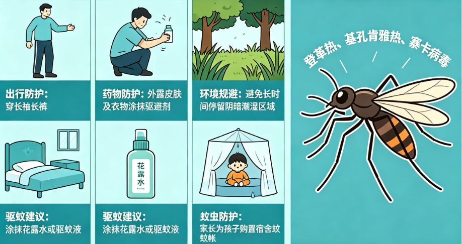 蚊虫防护:夏季是传染病高发期,注意预防登革热、基孔肯雅热、寨卡病毒等传染病。出行游玩时,应穿着长袖衣服和长裤,并在外露皮肤及衣物上涂抹蚊虫驱避药物。尽量避免长时间逗留在草丛、树荫等户外阴暗潮湿区域。涂抹花露水或驱蚊液,避免去往草丛茂密处。建议家长为孩子们购置宿舍蚊帐等防蚊用品。