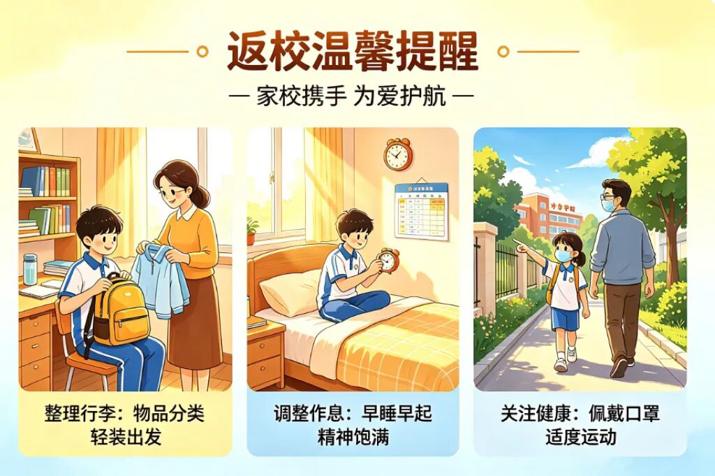 返校前,请您关注孩子的身体健康状况,若出现发热、咳嗽等不适症状,及时就医并告知班主任,暂缓返校,待身体康复后再办理返校手续。请配合学校做好孩子的假期情况反馈,引导孩子梳理假期收获,分享假期趣事,快速适应校园生活。