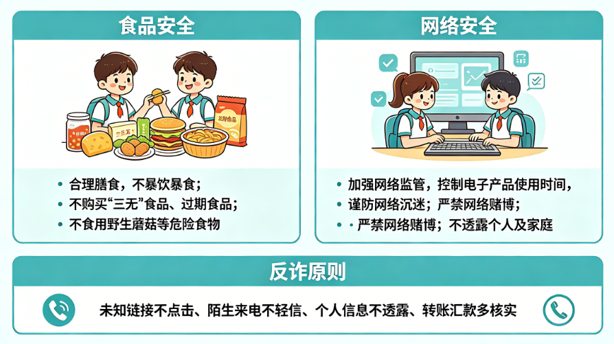 重视食品与网络安全:引导孩子合理膳食、不暴饮暴食,不购买“三无”食品、过期食品,不食用野生蘑菇等危险食物。加强孩子网络监管,控制电子产品使用时间,谨防网络沉迷;严禁网络赌博行为,提醒孩子不透露个人及家庭信息,不点击陌生链接,不与陌生网友见面,牢记“未知链接不点击、陌生来电不轻信、个人信息不透露、转账汇款多核实”的反诈原则。