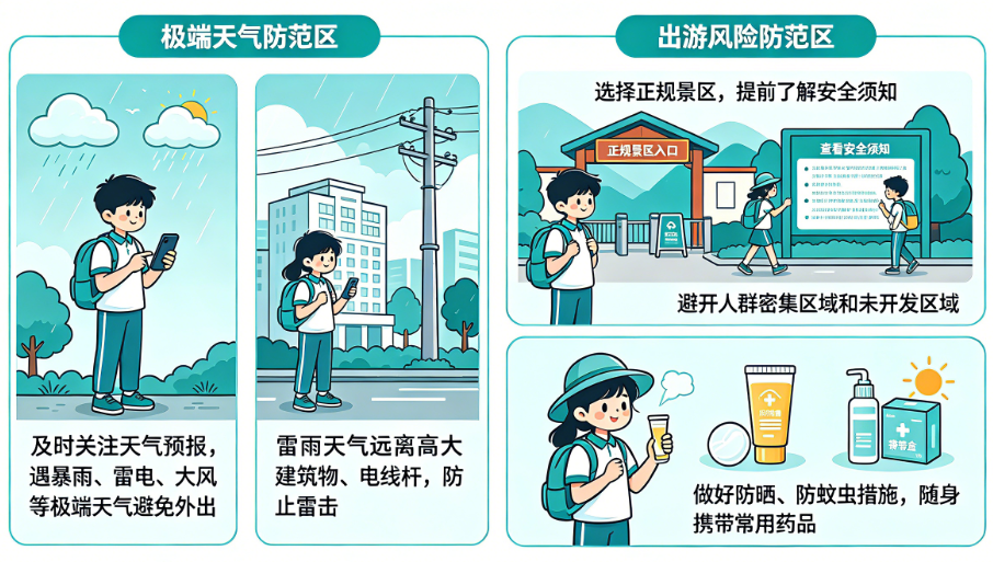 防范极端天气与出游风险:及时关注天气预报,遇暴雨、雷电、大风等极端天气,避免孩子外出;雷雨天气远离高大建筑物、电线杆等,防止雷击。外出游玩时,选择正规景区,提前了解安全须知,避开人群密集区域和未开发区域。