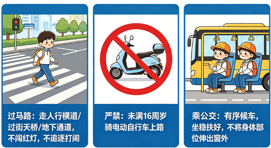 严守交通规则:假期出行请自觉遵守交通法规,教育孩子过马路走人行横道、过街天桥或地下通道,不闯红灯、不追逐打闹;严禁未满16周岁孩子骑电动自行车上路。自驾出行时,不疲劳驾驶、不酒驾;乘坐公共交通时,有序候车、坐稳扶好,不将身体部位伸出窗外。