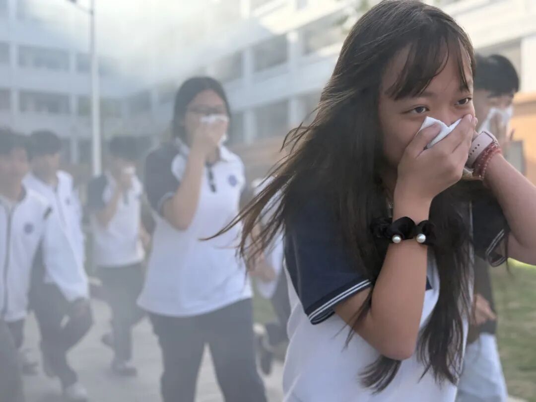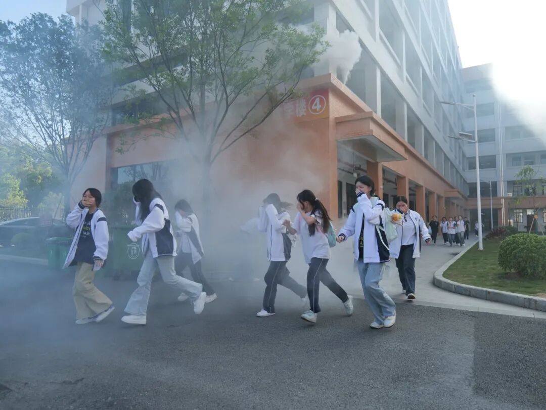 烟雾模拟环节逼真还原了火场环境,学生们弯腰低姿、用湿巾捂住口鼻,动作规范且迅速。师生们按照预定路线快速、有序地撤离至安全区域,整个过程紧张而不失条理。