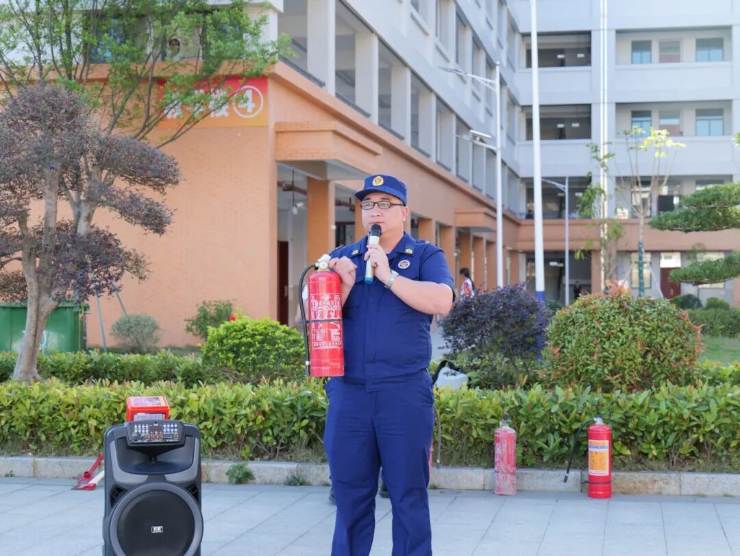 在消防安全教育活动现场,消防员耐心细致地为全体师生讲解灭火器的正确使用方法和关键要领,大家全神贯注地聆听,并且积极踊跃地与消防员进行互动交流,现场学习氛围十分浓厚。随后,在消防员的指导下,学生们按照班级分成若干小组,轮流开展灭火器使用的实操练习。